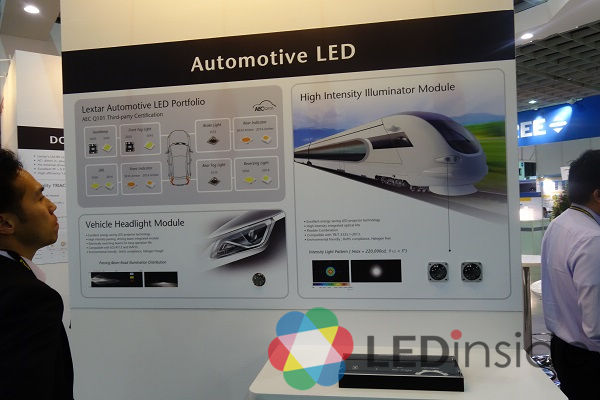 LED垂直整合厂隆达电子展出新款LED车头灯模组,锁定汽车及列车等高阶应用,采用隆达自行开发的光学及光源模组,目前主要锁定中国市场,看准未来中国动车的蓬勃发展。