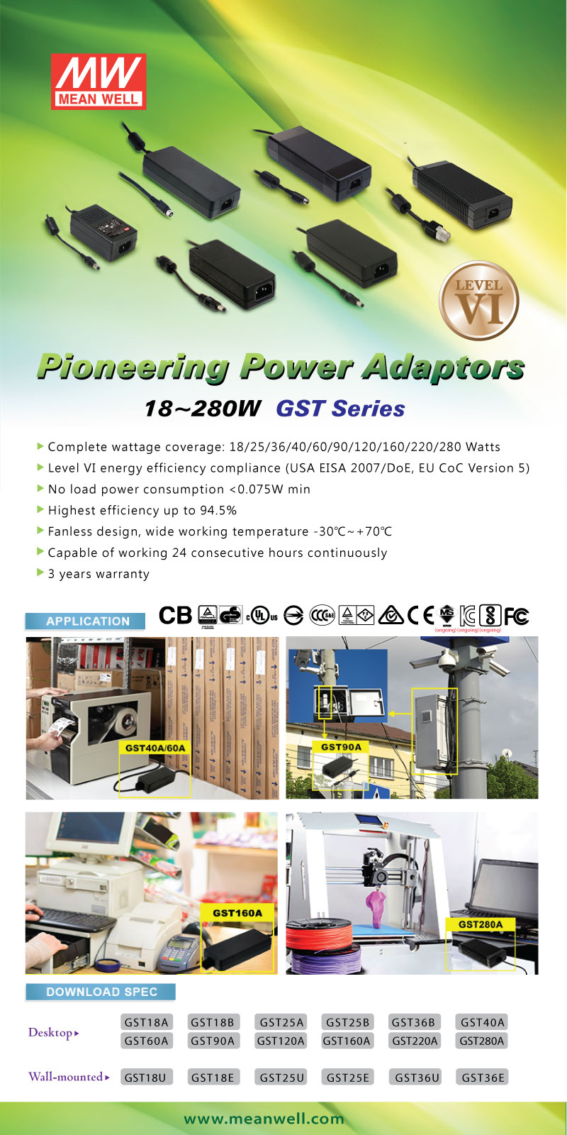 LevelVI/DoE绿能适配器GST18~280家族由于具备完整的认证、-30℃~+70℃超宽工作温度范围及3年高信赖保固等特点,上市一年多已快速累积销售达数十万台。jinnianhui今年会是标准电源领导品牌製造商,...